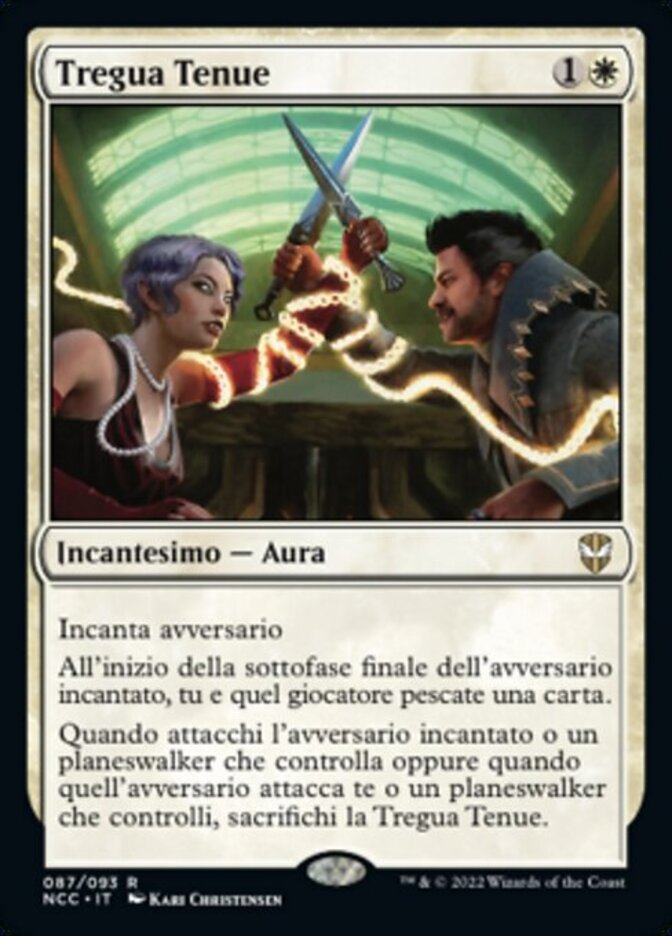 | Rules | Enchant opponent At the beginning of enchanted opponent's end step, you and that player each draw a card. When you attack enchanted opponent or a planeswalker they control or when they attack you or a planeswalker you control, sacrifice Tenuous Truce. |