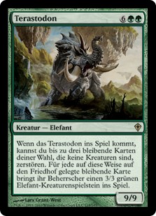 | Rules | When Terastodon enters the battlefield, you may destroy up to three target noncreature permanents. For each permanent put into a graveyard this way, its controller creates a 3/3 green Elephant creature token. |