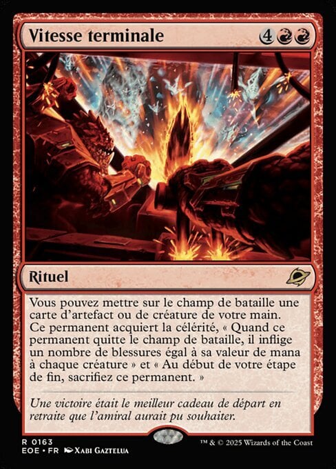 | Rules | You may put an artifact or creature card from your hand onto the battlefield. That permanent gains haste, "When this permanent leaves the battlefield, it deals damage equal to its mana value to each creature," and "At the beginning of your end step, sacrifice this permanent." |