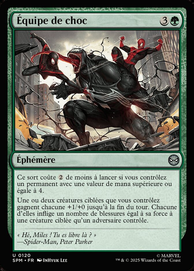 | Rules | This spell costs less to cast if you control a permanent with mana value 4 or greater. One or two target creatures you control each get +1/+0 until end of turn. They each deal damage equal to their power to target creature an opponent controls. |
