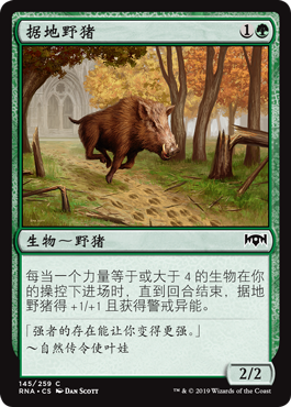 | Rules | Whenever a creature with power 4 or greater enters the battlefield under your control, Territorial Boar gets +1/+1 and gains vigilance until end of turn. |
