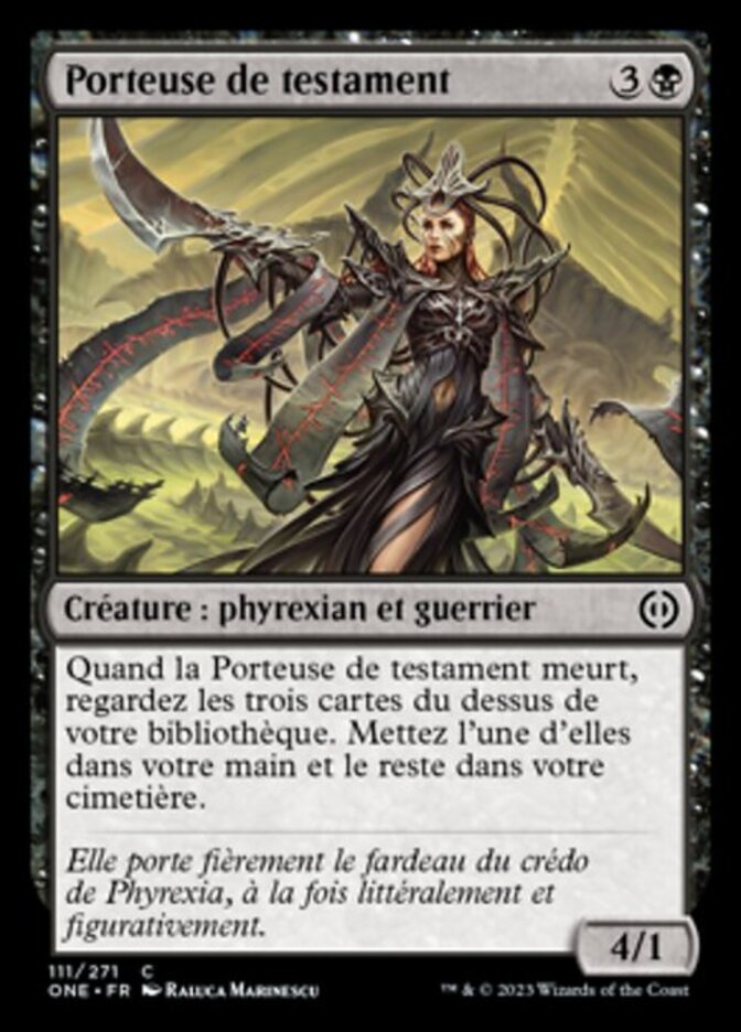 | Rules | When Testament Bearer dies, look at the top three cards of your library. Put one of them into your hand and the rest into your graveyard. |