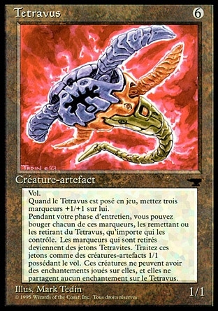 | Rules | Flying Tetravus enters the battlefield with three +1/+1 counters on it. At the beginning of your upkeep, you may remove any number of +1/+1 counters from Tetravus. If you do, create that many 1/1 colorless Tetravite artifact creature tokens. They each have flying and "This creature can't be enchanted." At the beginning of your upkeep, you may exile any number of tokens created with Tetravus. If you do, put that many +1/+1 counters on Tetravus. |