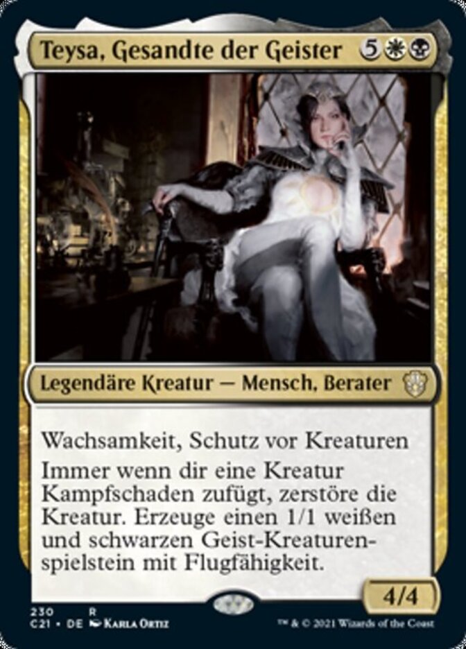 | Rules | Vigilance, protection from creatures Whenever a creature deals combat damage to you, destroy that creature. Create a 1/1 white and black Spirit creature token with flying. |