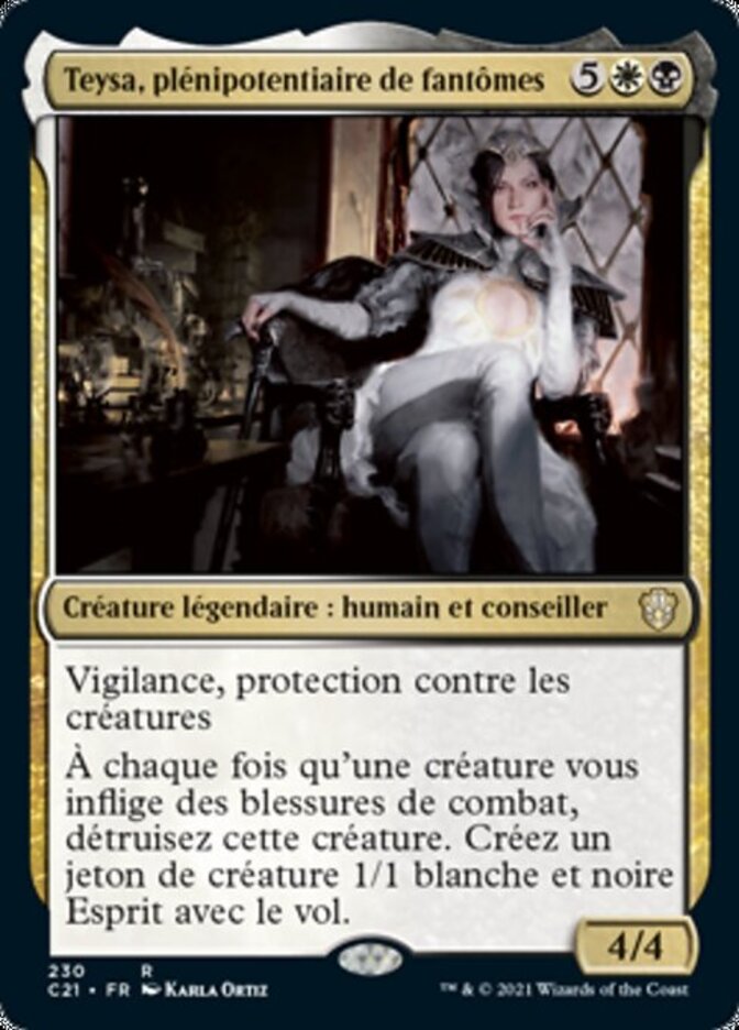 | Rules | Vigilance, protection from creatures Whenever a creature deals combat damage to you, destroy that creature. Create a 1/1 white and black Spirit creature token with flying. |