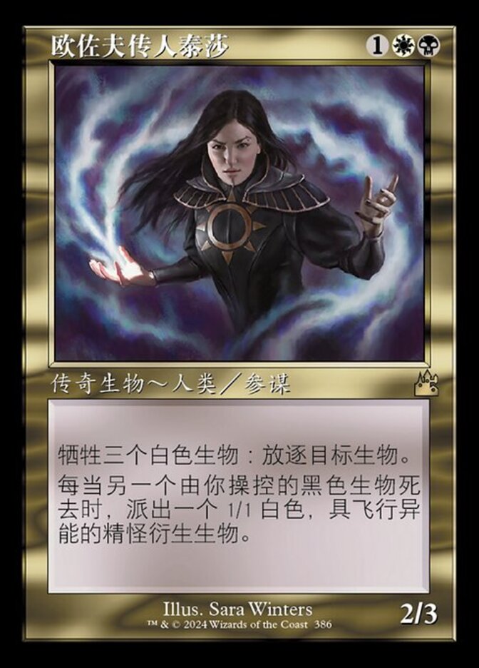 | Rules | Sacrifice three white creatures: Exile target creature. Whenever another black creature you control dies, create a 1/1 white Spirit creature token with flying. |