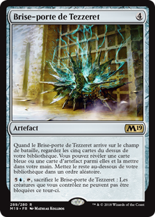 | Rules | When Tezzeret's Gatebreaker enters the battlefield, look at the top five cards of your library. You may reveal a blue or artifact card from among them and put it into your hand. Put the rest on the bottom of your library in a random order. , , Sacrifice Tezzeret's Gatebreaker: Creatures you control can't be blocked this turn. |