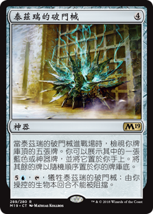 | Rules | When Tezzeret's Gatebreaker enters the battlefield, look at the top five cards of your library. You may reveal a blue or artifact card from among them and put it into your hand. Put the rest on the bottom of your library in a random order. , , Sacrifice Tezzeret's Gatebreaker: Creatures you control can't be blocked this turn. |