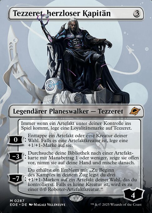 | Rules | Whenever an artifact you control enters, put a loyalty counter on Tezzeret. 0: Untap target artifact or creature. If it's an artifact creature, put a +1/+1 counter on it. −3: Search your library for an artifact card with mana value 1 or less, reveal it, put it into your hand, then shuffle. −7: You get an emblem with "At the beginning of combat on your turn, put three +1/+1 counters on target artifact you control. If it's not a creature, it becomes a 0/0 Robot artifact creature." |