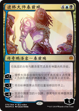 | Rules | Creature and planeswalker spells you cast have affinity for artifacts. (They cost less to cast for each artifact you control.) +2: Tezzeret, Master of the Bridge deals X damage to each opponent, where X is the number of artifacts you control. You gain X life. −3: Return target artifact card from your graveyard to your hand. −8: Exile the top ten cards of your library. Put all artifact cards from among them onto the battlefield. |