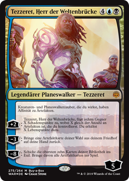 | Rules | Creature and planeswalker spells you cast have affinity for artifacts. (They cost less to cast for each artifact you control.) +2: Tezzeret, Master of the Bridge deals X damage to each opponent, where X is the number of artifacts you control. You gain X life. −3: Return target artifact card from your graveyard to your hand. −8: Exile the top ten cards of your library. Put all artifact cards from among them onto the battlefield. |