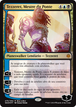 | Rules | Creature and planeswalker spells you cast have affinity for artifacts. (They cost less to cast for each artifact you control.) +2: Tezzeret, Master of the Bridge deals X damage to each opponent, where X is the number of artifacts you control. You gain X life. −3: Return target artifact card from your graveyard to your hand. −8: Exile the top ten cards of your library. Put all artifact cards from among them onto the battlefield. |