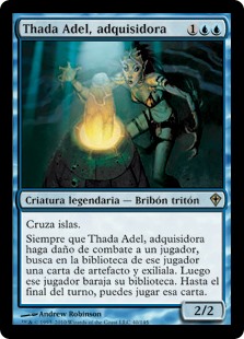 | Rules | Islandwalk (This creature can't be blocked as long as defending player controls an Island.) Whenever Thada Adel, Acquisitor deals combat damage to a player, search that player's library for an artifact card and exile it. Then that player shuffles. Until end of turn, you may play that card. |