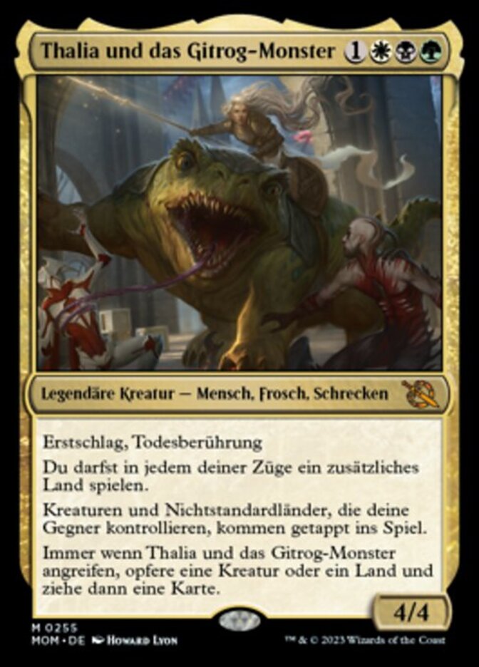 | Rules | First strike, deathtouch You may play an additional land on each of your turns. Creatures and nonbasic lands your opponents control enter the battlefield tapped. Whenever Thalia and The Gitrog Monster attacks, sacrifice a creature or land, then draw a card. |