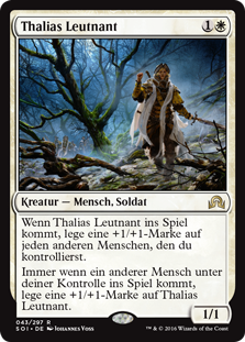 | Rules | When Thalia's Lieutenant enters the battlefield, put a +1/+1 counter on each other Human you control. Whenever another Human enters the battlefield under your control, put a +1/+1 counter on Thalia's Lieutenant. |