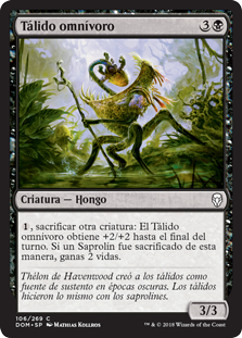 | Rules | , Sacrifice another creature: Thallid Omnivore gets +2/+2 until end of turn. If a Saproling was sacrificed this way, you gain 2 life. |