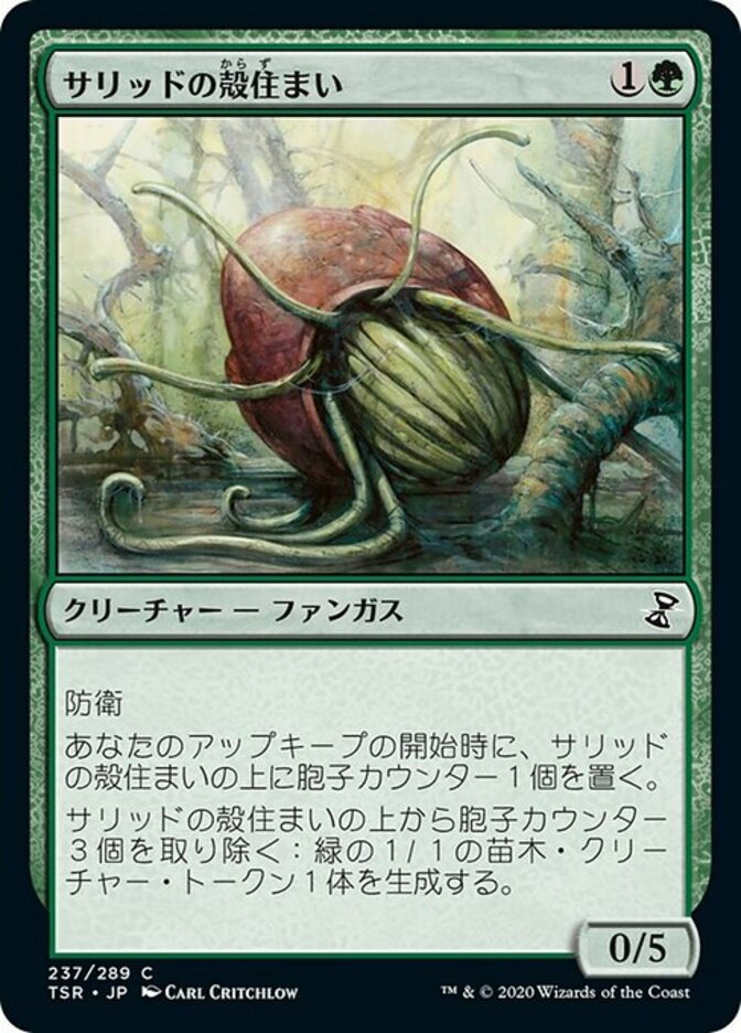 | Rules | Defender At the beginning of your upkeep, put a spore counter on Thallid Shell-Dweller. Remove three spore counters from Thallid Shell-Dweller: Create a 1/1 green Saproling creature token. |