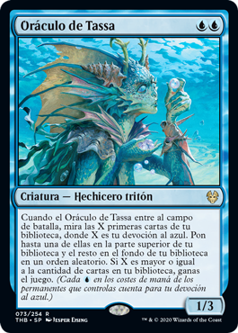 | Rules | When Thassa's Oracle enters the battlefield, look at the top X cards of your library, where X is your devotion to blue. Put up to one of them on top of your library and the rest on the bottom of your library in a random order. If X is greater than or equal to the number of cards in your library, you win the game. (Each in the mana costs of permanents you control counts toward your devotion to blue.) |