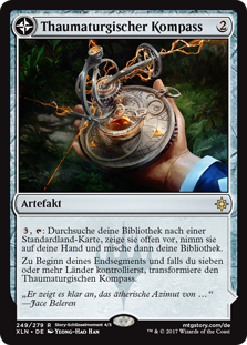 | Rules | , : Search your library for a basic land card, reveal it, put it into your hand, then shuffle. At the beginning of your end step, if you control seven or more lands, transform Thaumatic Compass. // (Transforms from Thaumatic Compass.) : Add . : Untap target attacking creature an opponent controls and remove it from combat. |