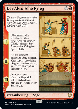 | Rules | (As this Saga enters and after your draw step, add a lore counter. Sacrifice after III.) I — Gain control of target creature for as long as The Akroan War remains on the battlefield. II — Until your next turn, creatures your opponents control attack each combat if able. III — Each tapped creature deals damage to itself equal to its power. |