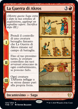| Rules | (As this Saga enters and after your draw step, add a lore counter. Sacrifice after III.) I — Gain control of target creature for as long as The Akroan War remains on the battlefield. II — Until your next turn, creatures your opponents control attack each combat if able. III — Each tapped creature deals damage to itself equal to its power. |