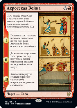 | Rules | (As this Saga enters and after your draw step, add a lore counter. Sacrifice after III.) I — Gain control of target creature for as long as The Akroan War remains on the battlefield. II — Until your next turn, creatures your opponents control attack each combat if able. III — Each tapped creature deals damage to itself equal to its power. |