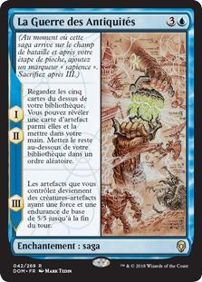 | Rules | (As this Saga enters and after your draw step, add a lore counter. Sacrifice after III.) I, II — Look at the top five cards of your library. You may reveal an artifact card from among them and put it into your hand. Put the rest on the bottom of your library in a random order. III — Artifacts you control become artifact creatures with base power and toughness 5/5 until end of turn. |