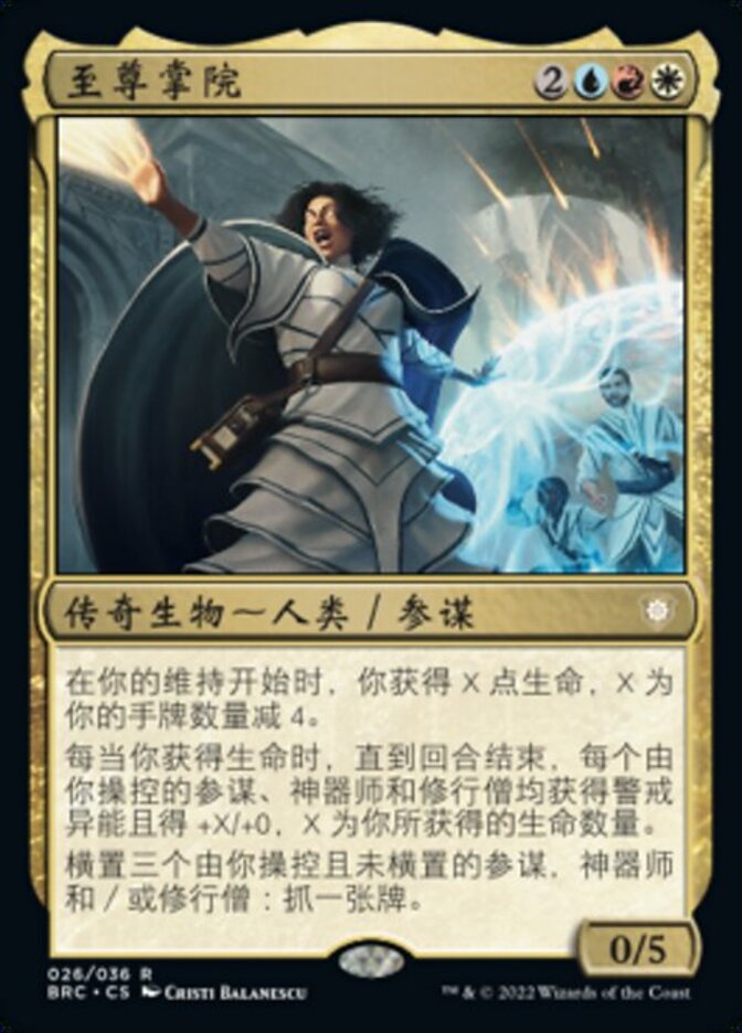 | Rules | At the beginning of your upkeep, you gain X life, where X is the number of cards in your hand minus 4. Whenever you gain life, each Advisor, Artificer, and Monk you control gains vigilance and gets +X/+0 until end of turn, where X is the amount of life you gained. Tap three untapped Advisors, Artificers, and/or Monks you control: Draw a card. |