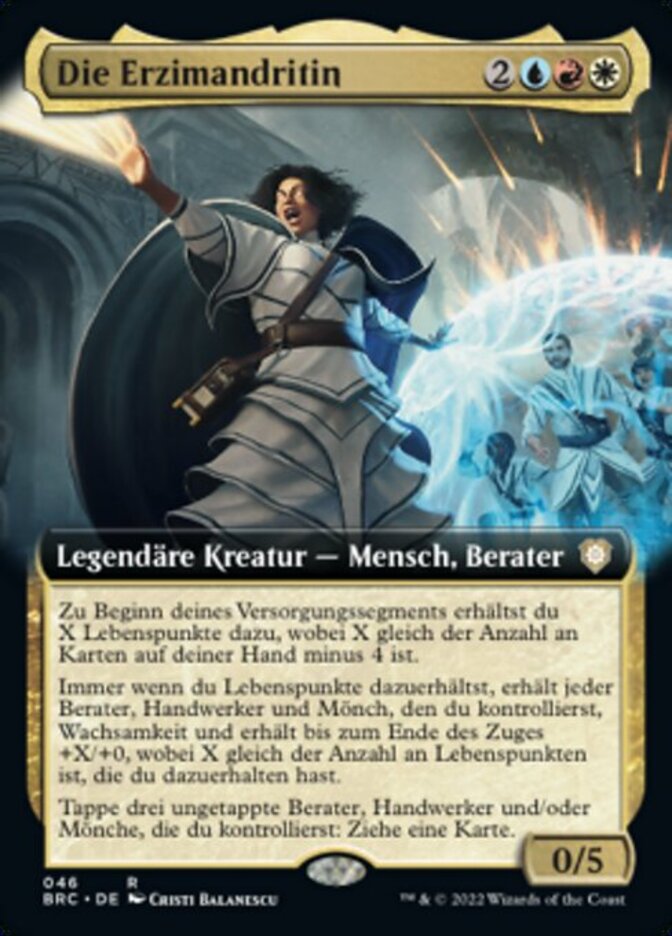 | Rules | At the beginning of your upkeep, you gain X life, where X is the number of cards in your hand minus 4. Whenever you gain life, each Advisor, Artificer, and Monk you control gains vigilance and gets +X/+0 until end of turn, where X is the amount of life you gained. Tap three untapped Advisors, Artificers, and/or Monks you control: Draw a card. |