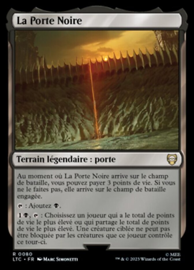 | Rules | As The Black Gate enters the battlefield, you may pay 3 life. If you don't, it enters the battlefield tapped. : Add . , : Choose a player with the most life or tied for most life. Target creature can't be blocked by creatures that player controls this turn. |
