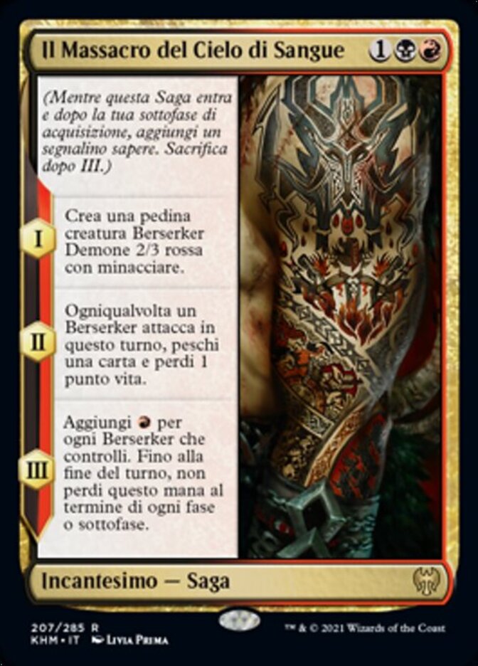 | Rules | (As this Saga enters and after your draw step, add a lore counter. Sacrifice after III.) I — Create a 2/3 red Demon Berserker creature token with menace. II — Whenever a Berserker attacks this turn, you draw a card and you lose 1 life. III — Add for each Berserker you control. Until end of turn, you don't lose this mana as steps and phases end. |