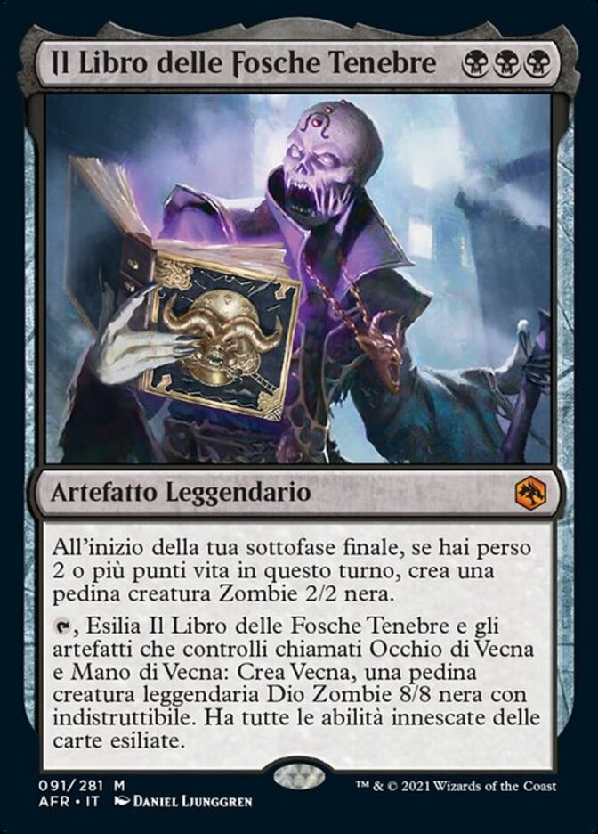 | Rules | At the beginning of your end step, if you lost 2 or more life this turn, create a 2/2 black Zombie creature token. , Exile The Book of Vile Darkness and artifacts you control named Eye of Vecna and Hand of Vecna: Create Vecna, a legendary 8/8 black Zombie God creature token with indestructible and all triggered abilities of the exiled cards. |