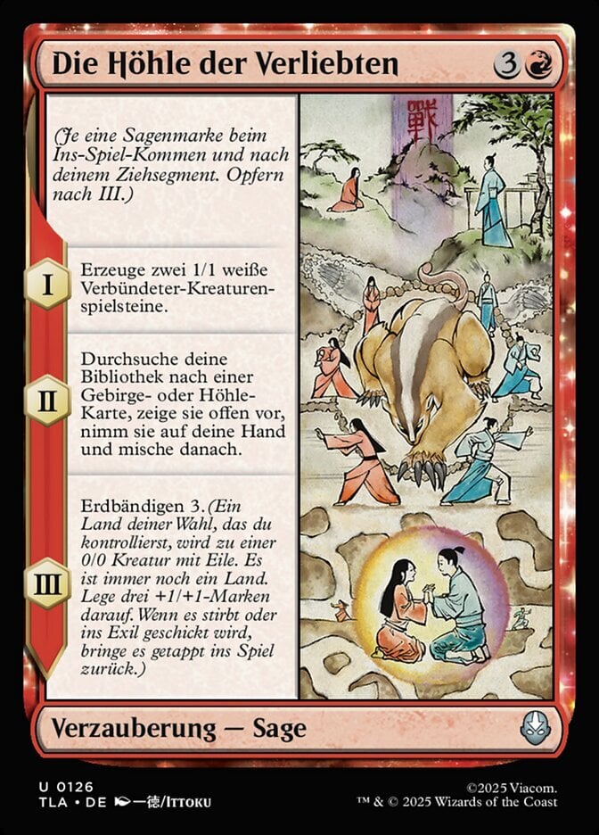 | Rules | (As this Saga enters and after your draw step, add a lore counter. Sacrifice after III.) I — Create two 1/1 white Ally creature tokens. II — Search your library for a Mountain or Cave card, reveal it, put it into your hand, then shuffle. III — Earthbend 3. (Target land you control becomes a 0/0 creature with haste that's still a land. Put three +1/+1 counters on it. When it dies or is exiled, return it to the battlefield tapped.) |