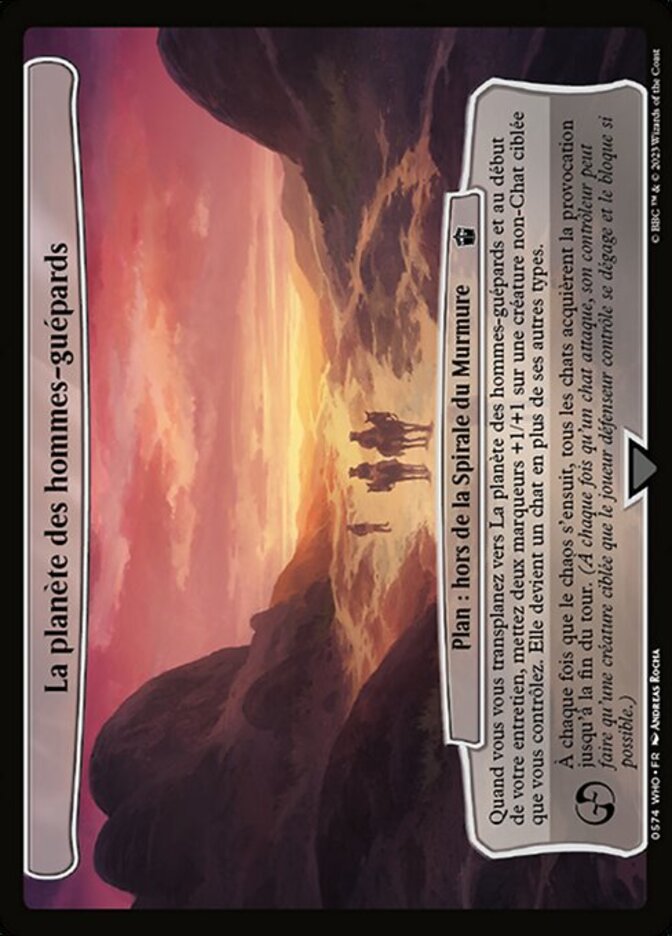 | Rules | When you planeswalk to The Cheetah Planet and at the beginning of your upkeep, put two +1/+1 counters on target non-Cat creature you control. It becomes a Cat in addition to its other types. Whenever chaos ensues, all Cats gain provoke until end of turn. (Whenever a Cat attacks, its controller may have target creature defending player controls untap and block it if able.) |
