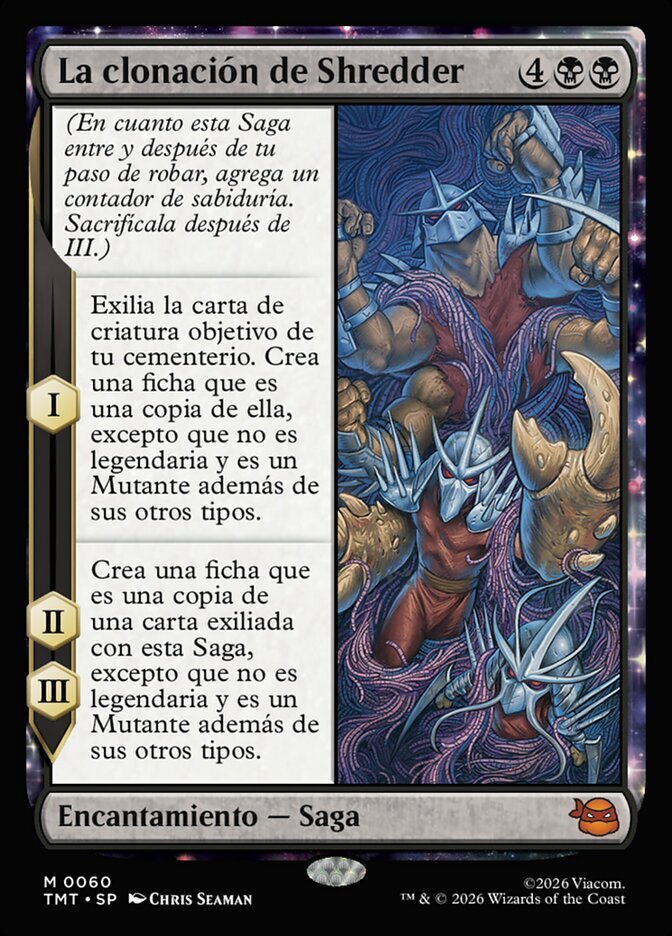 | Rules | (As this Saga enters and after your draw step, add a lore counter. Sacrifice after III.) I — Exile target creature card from your graveyard. Create a token that's a copy of it, except it isn't legendary and is a Mutant in addition to its other types. II, III — Create a token that's a copy of a card exiled with this Saga, except it isn't legendary and is a Mutant in addition to its other types. |