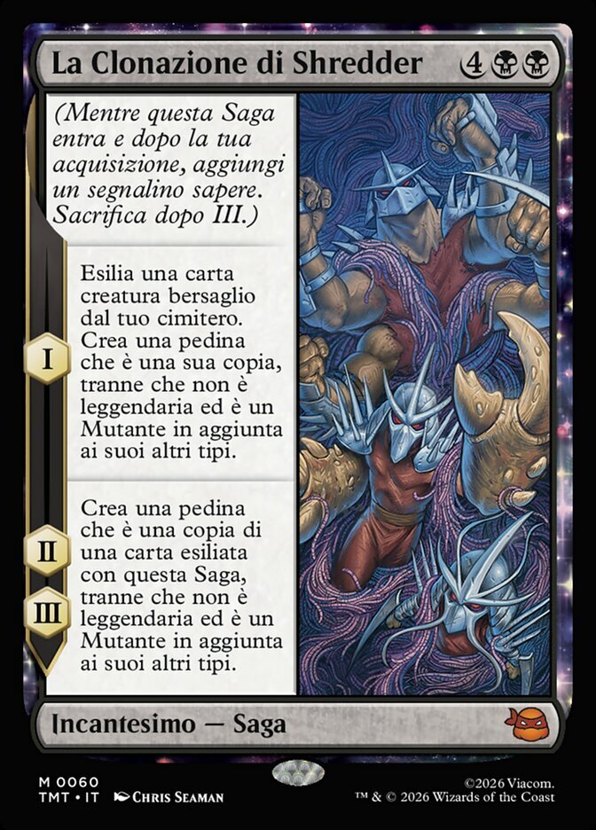 | Rules | (As this Saga enters and after your draw step, add a lore counter. Sacrifice after III.) I — Exile target creature card from your graveyard. Create a token that's a copy of it, except it isn't legendary and is a Mutant in addition to its other types. II, III — Create a token that's a copy of a card exiled with this Saga, except it isn't legendary and is a Mutant in addition to its other types. |