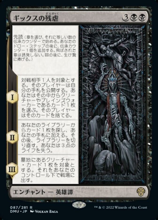 | Rules | Read ahead (Choose a chapter and start with that many lore counters. Add one after your draw step. Skipped chapters don't trigger. Sacrifice after III.) I — Target opponent reveals their hand. You choose a creature or planeswalker card from it. That player discards that card. II — Search your library for a card, put that card into your hand, then shuffle. You lose 3 life. III — Put target creature card from a graveyard onto the battlefield under your control. |