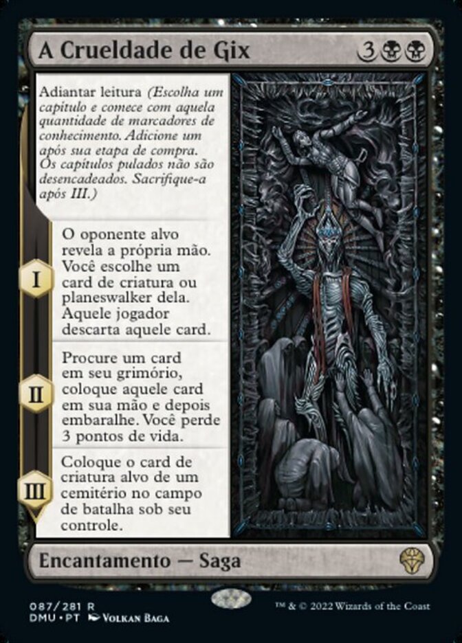 | Rules | Read ahead (Choose a chapter and start with that many lore counters. Add one after your draw step. Skipped chapters don't trigger. Sacrifice after III.) I — Target opponent reveals their hand. You choose a creature or planeswalker card from it. That player discards that card. II — Search your library for a card, put that card into your hand, then shuffle. You lose 3 life. III — Put target creature card from a graveyard onto the battlefield under your control. |