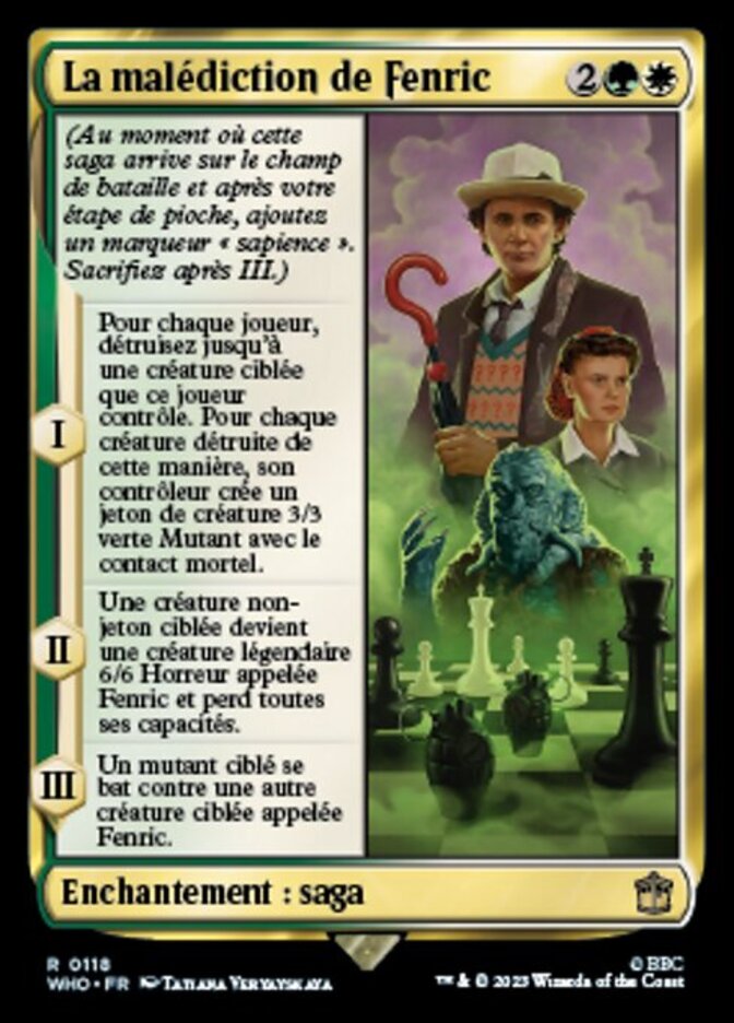 | Rules | (As this Saga enters and after your draw step, add a lore counter. Sacrifice after III.) I — For each player, destroy up to one target creature that player controls. For each creature destroyed this way, its controller creates a 3/3 green Mutant creature token with deathtouch. II — Target nontoken creature becomes a 6/6 legendary Horror creature named Fenric and loses all abilities. III — Target Mutant fights another target creature named Fenric. |