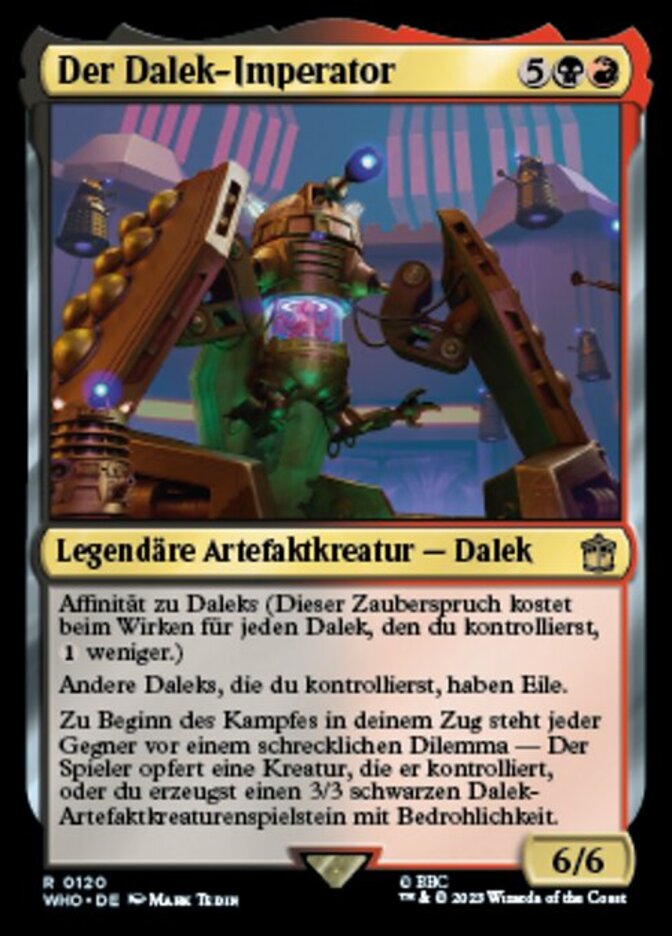| Rules | Affinity for Daleks (This spell costs less to cast for each Dalek you control.) Other Daleks you control have haste. At the beginning of combat on your turn, each opponent faces a villainous choice — That player sacrifices a creature they control, or you create a 3/3 black Dalek artifact creature token with menace. |