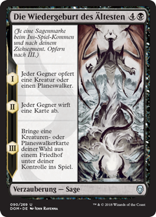 | Rules | (As this Saga enters and after your draw step, add a lore counter. Sacrifice after III.) I — Each opponent sacrifices a creature or planeswalker. II — Each opponent discards a card. III — Put target creature or planeswalker card from a graveyard onto the battlefield under your control. |