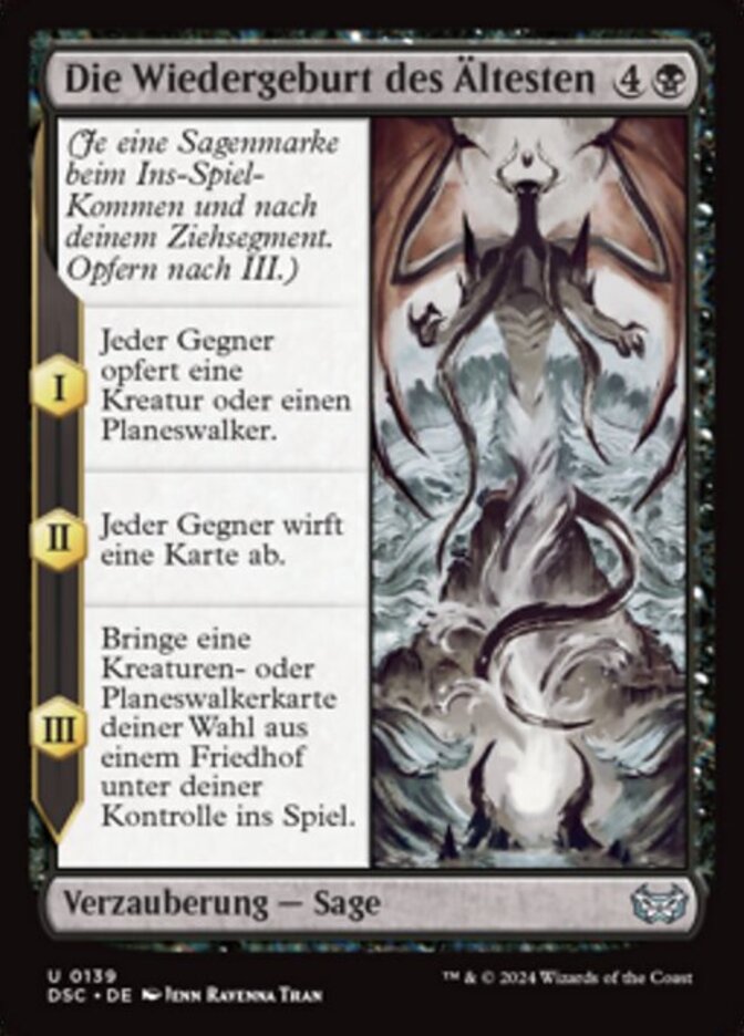 | Rules | (As this Saga enters and after your draw step, add a lore counter. Sacrifice after III.) I — Each opponent sacrifices a creature or planeswalker. II — Each opponent discards a card. III — Put target creature or planeswalker card from a graveyard onto the battlefield under your control. |