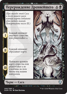 | Rules | (As this Saga enters and after your draw step, add a lore counter. Sacrifice after III.) I — Each opponent sacrifices a creature or planeswalker. II — Each opponent discards a card. III — Put target creature or planeswalker card from a graveyard onto the battlefield under your control. |