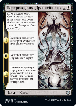 | Rules | (As this Saga enters and after your draw step, add a lore counter. Sacrifice after III.) I — Each opponent sacrifices a creature or planeswalker. II — Each opponent discards a card. III — Put target creature or planeswalker card from a graveyard onto the battlefield under your control. |
