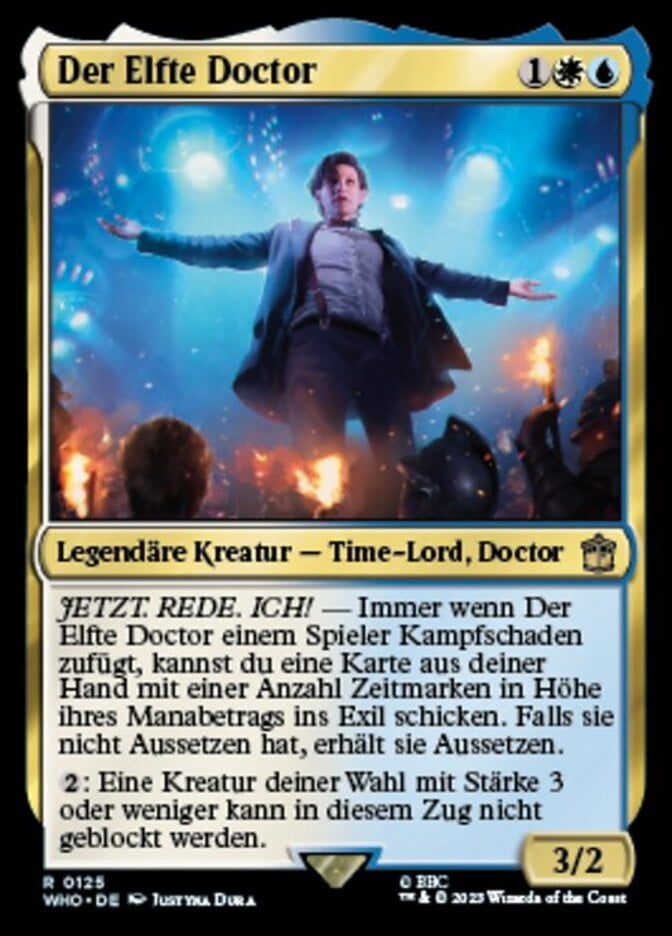 | Rules | I. AM. TALKING! — Whenever The Eleventh Doctor deals combat damage to a player, you may exile a card from your hand with a number of time counters on it equal to its mana value. If it doesn't have suspend, it gains suspend. : Target creature with power 3 or less can't be blocked this turn. |