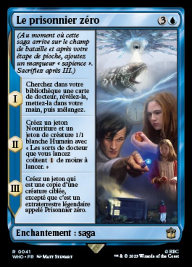 | Rules | (As this Saga enters and after your draw step, add a lore counter. Sacrifice after III.) I — Search your library for a Doctor card, reveal it, put it into your hand, then shuffle. II — Create a Food token and a 1/1 white Human creature token with "Doctor spells you cast cost less to cast." III — Create a token that's a copy of target creature, except it's a legendary Alien named Prisoner Zero. |