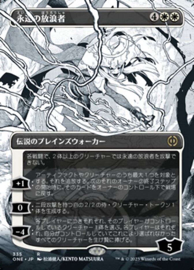| Rules | No more than one creature can attack The Eternal Wanderer each combat. +1: Exile up to one target artifact or creature. Return that card to the battlefield under its owner's control at the beginning of that player's next end step. 0: Create a 2/2 white Samurai creature token with double strike. −4: For each player, choose a creature that player controls. Each player sacrifices all creatures they control not chosen this way. |