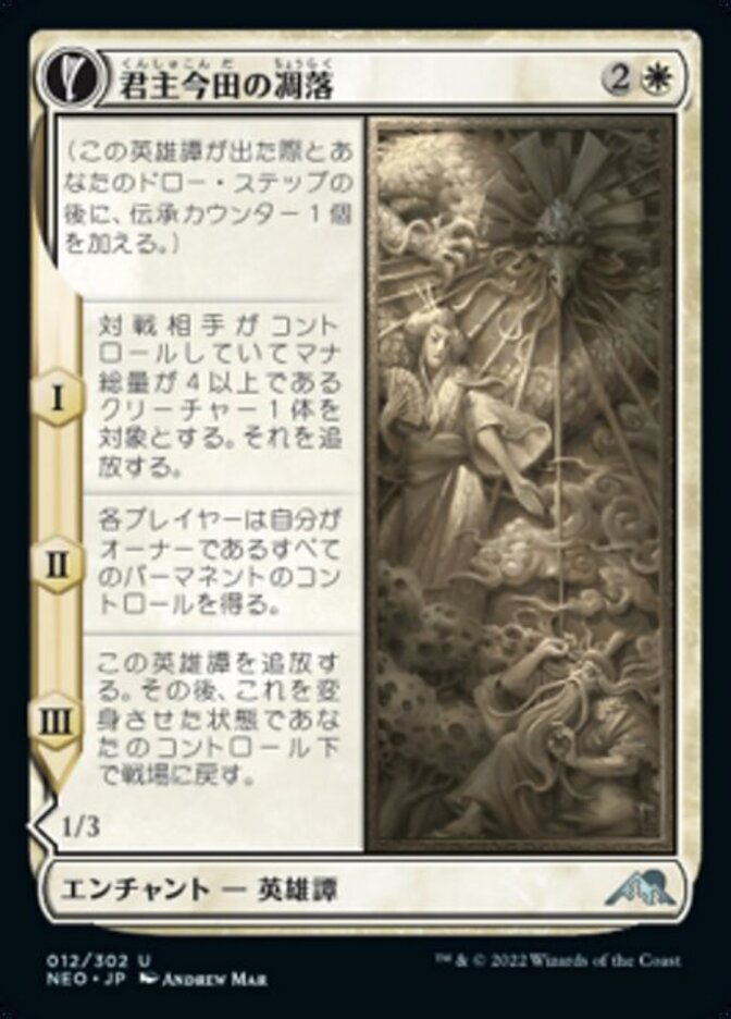 | Rules | (As this Saga enters and after your draw step, add a lore counter.) I — Exile target creature an opponent controls with mana value 4 or greater. II — Each player gains control of all permanents they own. III — Exile this Saga, then return it to the battlefield transformed under your control. // Defender When Fragment of Konda dies, draw a card. |