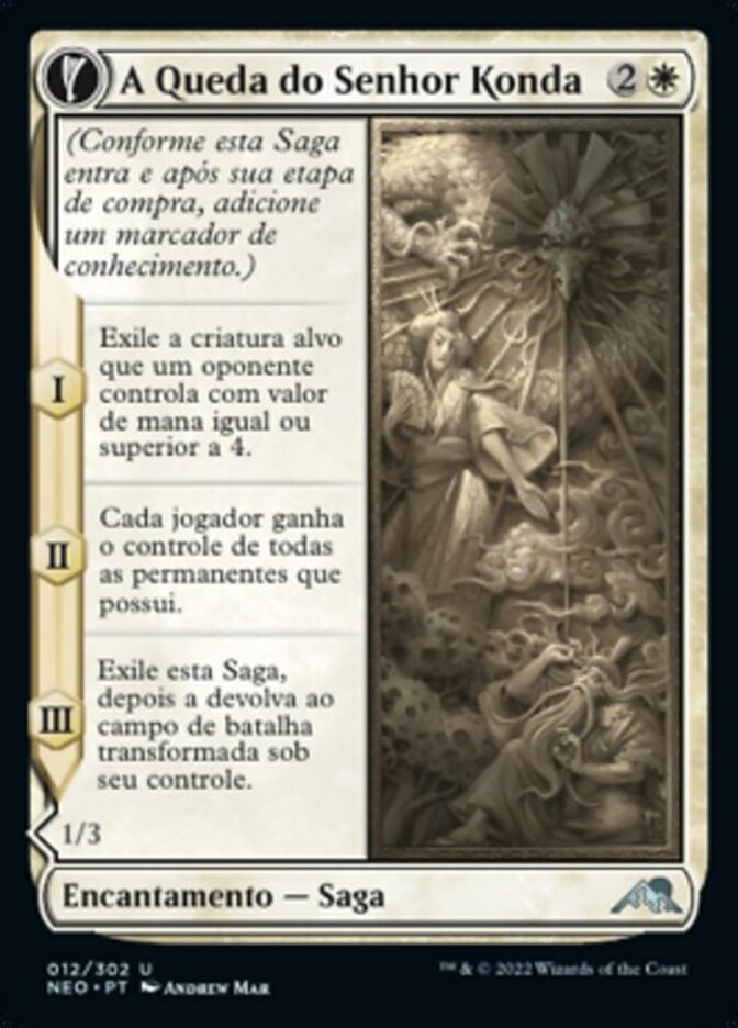 | Rules | (As this Saga enters and after your draw step, add a lore counter.) I — Exile target creature an opponent controls with mana value 4 or greater. II — Each player gains control of all permanents they own. III — Exile this Saga, then return it to the battlefield transformed under your control. // Defender When Fragment of Konda dies, draw a card. |