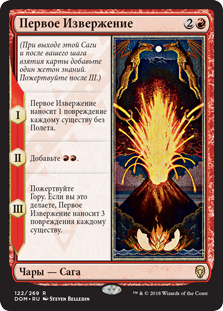 | Rules | (As this Saga enters and after your draw step, add a lore counter. Sacrifice after III.) I — The First Eruption deals 1 damage to each creature without flying. II — Add . III — Sacrifice a Mountain. If you do, The First Eruption deals 3 damage to each creature. |